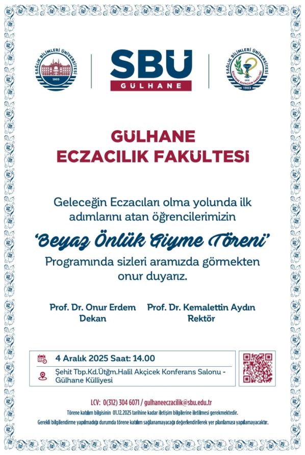 Gülhane Eczacılık Fakültesi 1. sınıf öğrencilerimizin meslek hayatlarına attıkları ilk adımı simgeleyen Önlük Giyme Töreni, 4 Aralık 2025 Perşembe günü saat 14.00’te Şehit Tbp. Kd. Ütğm. Halil Akçiçek Konferans Salonu’nda gerçekleştirilecektir.